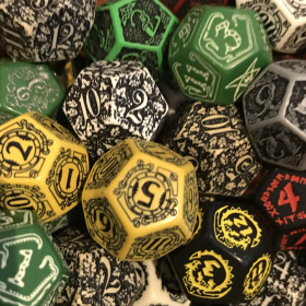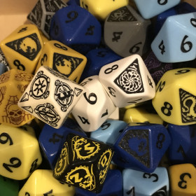 Contient le set de 7 dés (1D4, 1D6, 1D8, 1D10 unité, 1D10 dizaine, 1D12, 1D20)